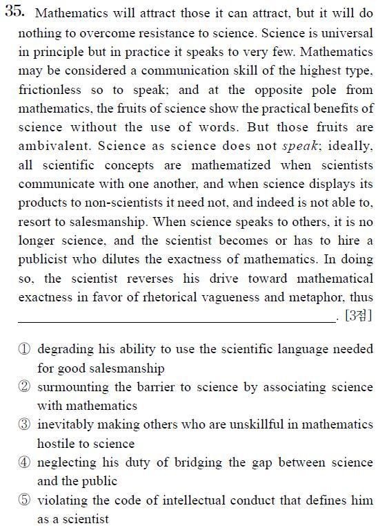 글에서 문제에 해당하는 부분으로 ctrl+F로 검색하면 답은 5번이다. 지문은 과학자가 과학자들끼리 과학을 할 때의 수학적인 엄밀함을 어기고 보통 사람들에게 두루뭉술해질 수 있는 비유나 수사로 개념을 설명해야 하는 상황을 논한다.
