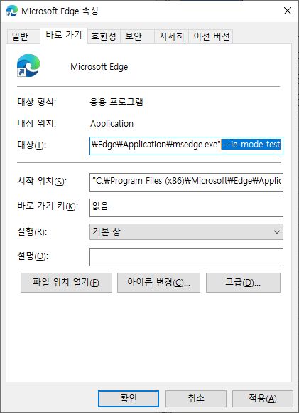 바로가기에 아래와 같이 --ie-mode-test 를 추가해 주십시오.