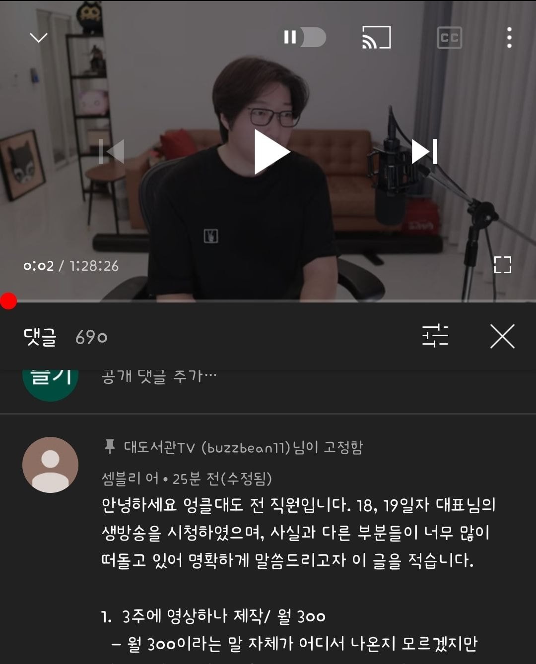- 대표님의 팬이라 입사 당시 환상을 가진 점은 분명합니다. 그러나 업무 특성상 이는 곧 대도서관이라는 크리에이터의 셀링포인트를 아는 직원이라는 뜻도 됩니다. 되려 환상은 회사생활을 하다 보면 자연히 사라지게 되고, 팬으로서 실망한 것과는 별개로 사회생활이란것은 생계와도 직접적인 관련이 있기에 사적인 감정을 담지않는것은 당연한 것이고 그것이 업무에 영향을 미치지 않았습니다.