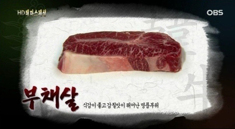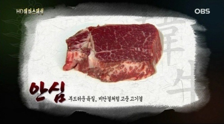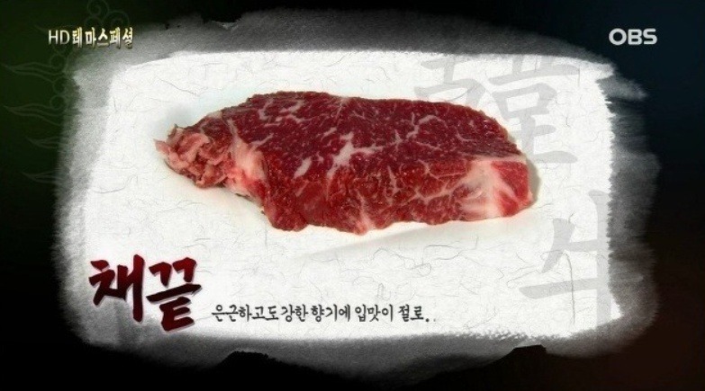 고기의 결이 곱고 비육이 잘된 소의 채끝은 고기속에 대리석상 지방이 박힌것도 있음.