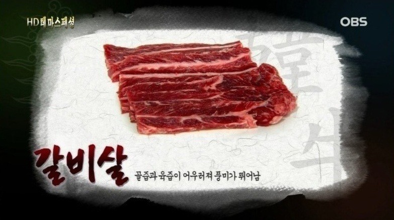 용도 불갈비, 찜, 탕, 구이특징:옆구리 늑골을 감싸고 있는 부위 늑골은 13대이며 육질은 근육조직과 지방조직이 3중으로 형성되어 있으며 특이한 맛이 있음.