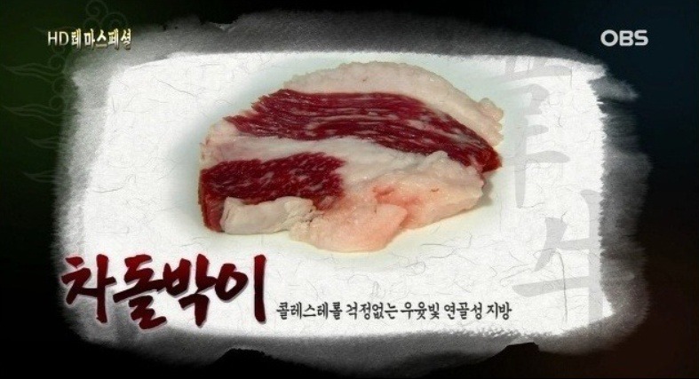 특징 : 긴머리양지 하단으로 단백질 지방조직 흰색의 단단한 기름을 말하는데 육질이 돌과 같다고 하여 붙여진 이름으로 얇게 썰어 구이용 돌판에 구워서 먹는구울 때 독툭한 풍미. 맛이 일품이고 국물을 끓이면 가장 구수한 맛이