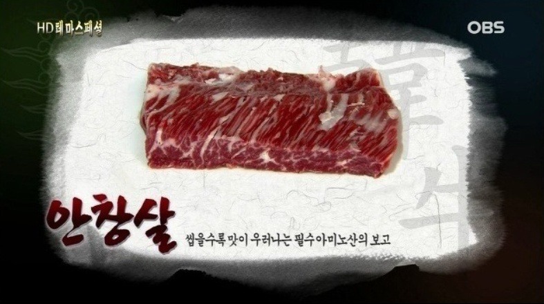 특징 : 양지의 앞부위. 표면 및 그육사이에 다량의 지방괴 함유.