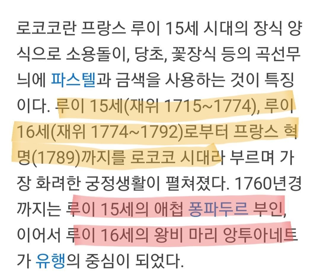프랑스 혁명 직전의 가장 사치스럽고 화려했던 로코코 시대이기 때문임.
