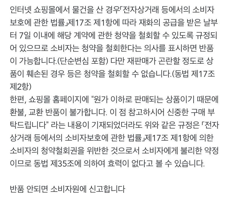 그러니까 아니나 다를까 인터넷에서 구매한 상품 같은 경우는 구매자가 7일 이내에 취소가 가능하고, 세일상품 등 원가 이하로 판매하는 제품의 경우 환불할 수 없다고 명시되었더라도 소비자에게 불리한 요건이므로 반품이 가능하대.