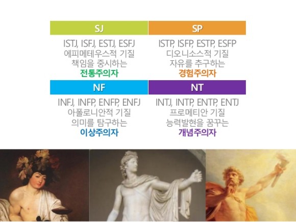 4) NT기질 : 합리적 기질 – 지식지향, 자질향상, 지식추구, 초자연적인 힘, 지적임, 비전이 중요, 지식이 가장 중요, 이론적, 논리적, 자신감 실현의 욕구