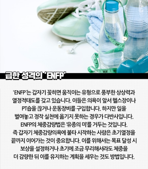 ENFP - 바로 체중감량을 시작하며 장비 및 시설에 가장 많은 투자를 하나 성공하지 못할 가능성이 높은 유형.