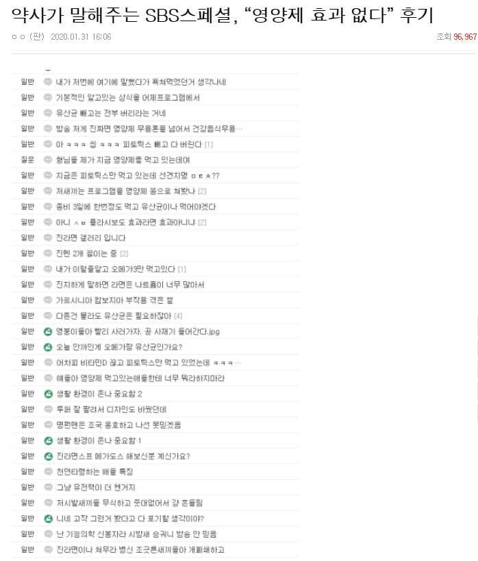 사실 방송에서는 영양제 효과 있다는 내용과 효과 없다는 내용을 번갈아 보여주고 열린 결말을 지었는데요 아무래도 사람에게 각인될 때는 뒤에 나온 정보가 좀 더 강력하게 각인 되다 보니 무용론에 좀 더 힘이 실렸던 것 같아요 그리고 사실상 후반부 내용도 무용론 보다는 영양이 충분한 상태에서의 보충이 필요 없다는 내용이었는데 떠들기 좋아하는 몇몇에 의해 와전된 감도 없지 않아 있네요