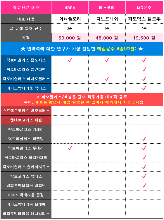 추가) 유산균 고를 때 균주를 잘 보셔야 하는데요. 잘 정리된 글을 봐서, 공유드려요 여성 유산균 분석표이긴 한데 특허균주를 제외하고는 일반균주와 동일한 기전을 갖고 있으니 기업명은 빼고 다른 제품 구매하실 때 참고하시면 좋을듯 합니다.