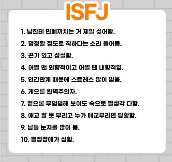 | 재미로 보는 MBTI - 성격유형별 남자친구 특성,ISFJ (0) | 2021.06.19 |