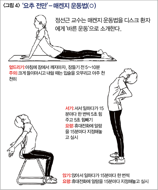 맥켄지운동(*아래 영상 참고)과 빨리 걷기(허리를 펴고 바른자세로 시속 6~7km 정도)운동을 병행한다.