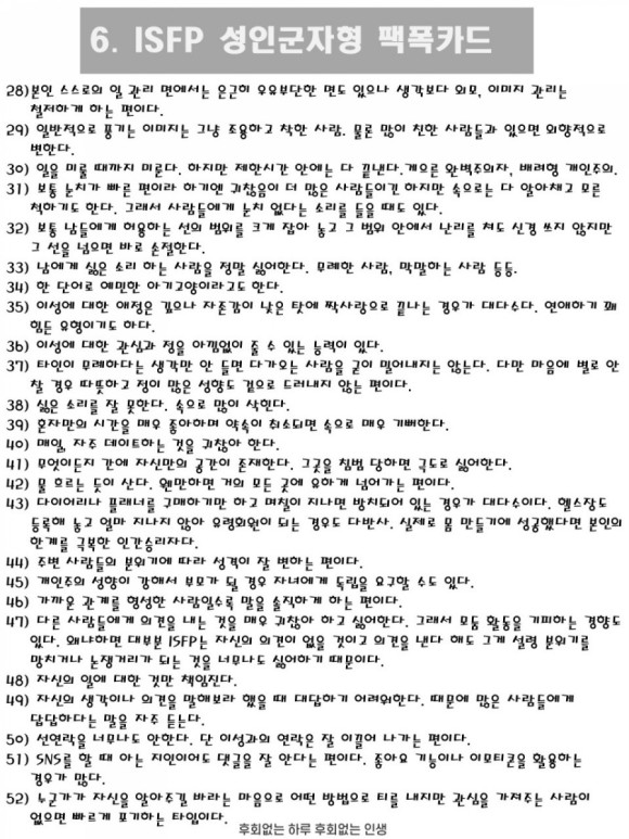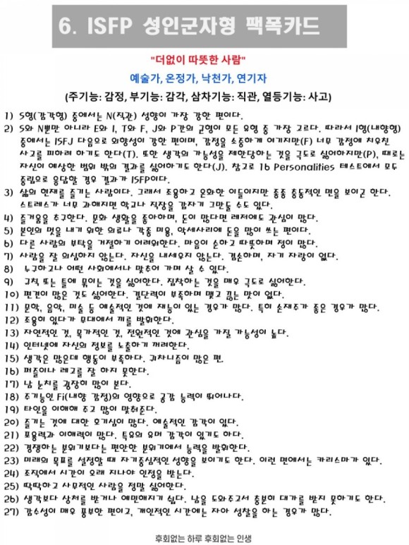 | 재미로 보는 MBTI - 성격유형별 팩폭카드 5. ISFJ(임금님뒤 권력형) (0) | 2021.06.20 |