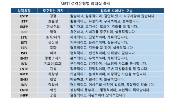 각 성격유형별 조직에서 추구하는 가치와 리더의 역할을 수행할 때 나타나는 행동의 특징들을 정리한 자료입니다