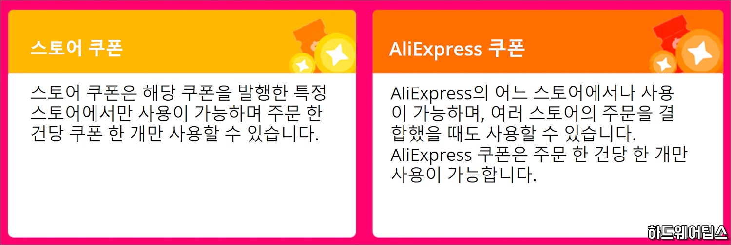 AliExpress의 어느 스토어에서나 사용이 가능하며, 여러 스토어의 주문을 결합했을 때도 사용할 수 있습니다. AliExpress 쿠폰은 주문 한 건당 한 개만 사용이 가능합니다. 주문 시 코드를 입력하거나 등록된 쿠폰을 선택하면 할인이 자동 적용됩니다.스토어 쿠폰