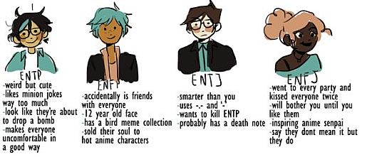 당신보다 똑똑하다, -.-나 '-' 같은 이모티콘 사용, ENTP를 죽이고 싶어함, 데스노트를 갖고 있을지도 모름