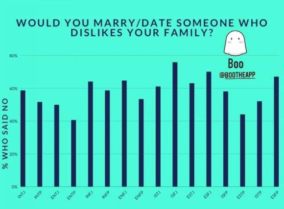 MBTI 유형별로 '본인 가족 구성원과 사이가 좋지 않은 애인과 결혼(연애)를 할 것인가? ' 라는 질문에 대한 답변통계 자료가 있네요.