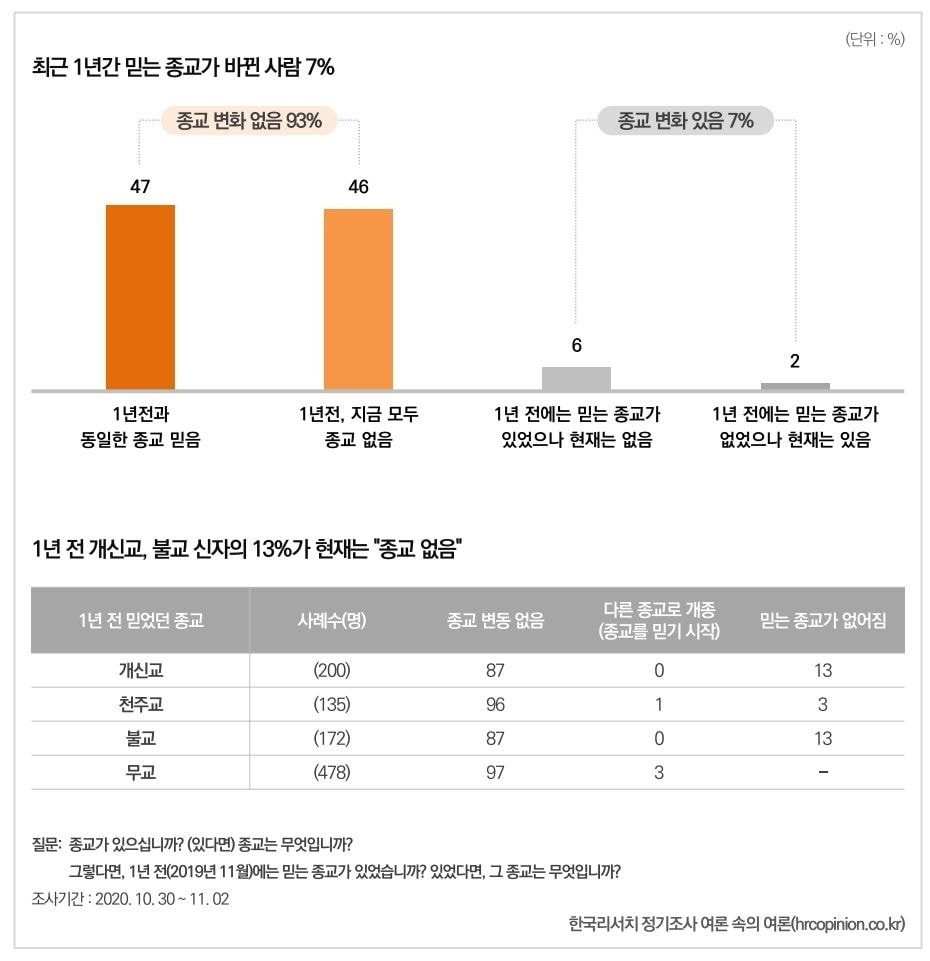 1년 전인 2019년 11월과 동일한 종교를 현재도 믿는 사람은 47%, 1년 전과 현재 모두 믿는 종교가 없는 사람은 46%로, 모두 합해 93%는 종교에 변화가 없었다. 종교에 변화가 있는 사람은 전체의 7%였는데 구체적으로 살펴보면, 1년 전에는 믿는 종교가 있었으나 현재는 없다고 답한 사람이 6%, 반대로 1년 전에는 믿는 종교가 없었으나 현재는 있다고 답한 사람이 2%였다. 종교별로 살펴보면, 1년 전 개신교를 믿었던 사람 중 13%가 현재는 종교가 없다고 답했다. 1년 전 불교를 믿었던 사람 중에서도 13%가 현재는 종교가 없다고 답했다. 반면 천주교 신자의 이탈률은 4%에 그쳐 상대적으로 적었다.