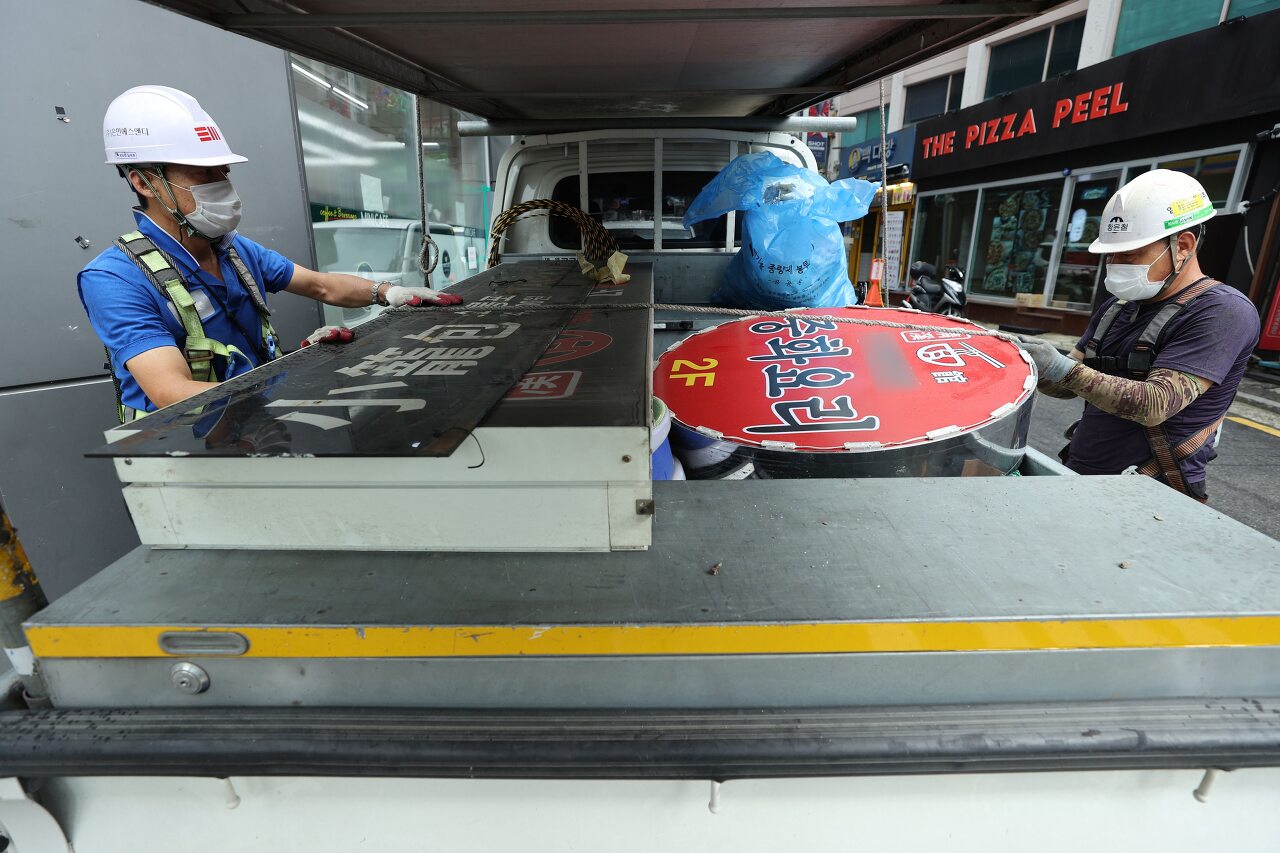 서울 종로구청 도시디자인과 광고물정비팀 관계자들이 10일 오전 서울 종로구의 한 폐업 식당 간판을 철거하고 있다. /연합뉴스
