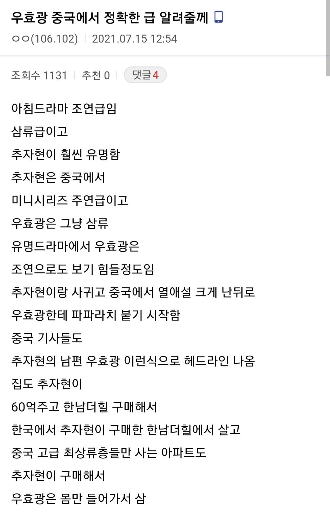 | 한국이 선진국이 되었다는 소식에 열폭하는 중국인들 (0) | 2021.07.17 |