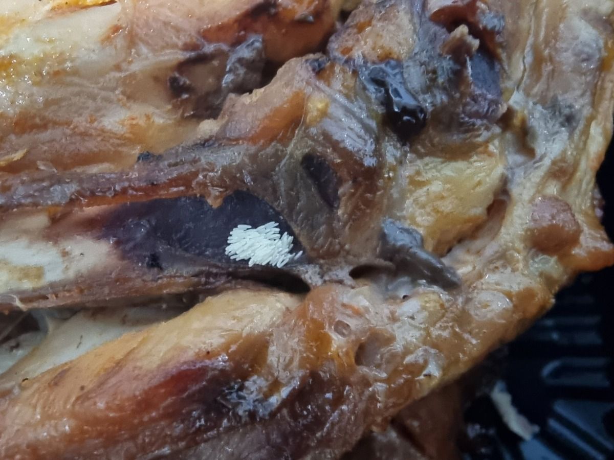 게시자는 13일 저녁 구매한 영수증 인증과 함께 닭다리 위에 무언가 하얀 밥알 같은 게 쌓여있는 사진을 공개했다.