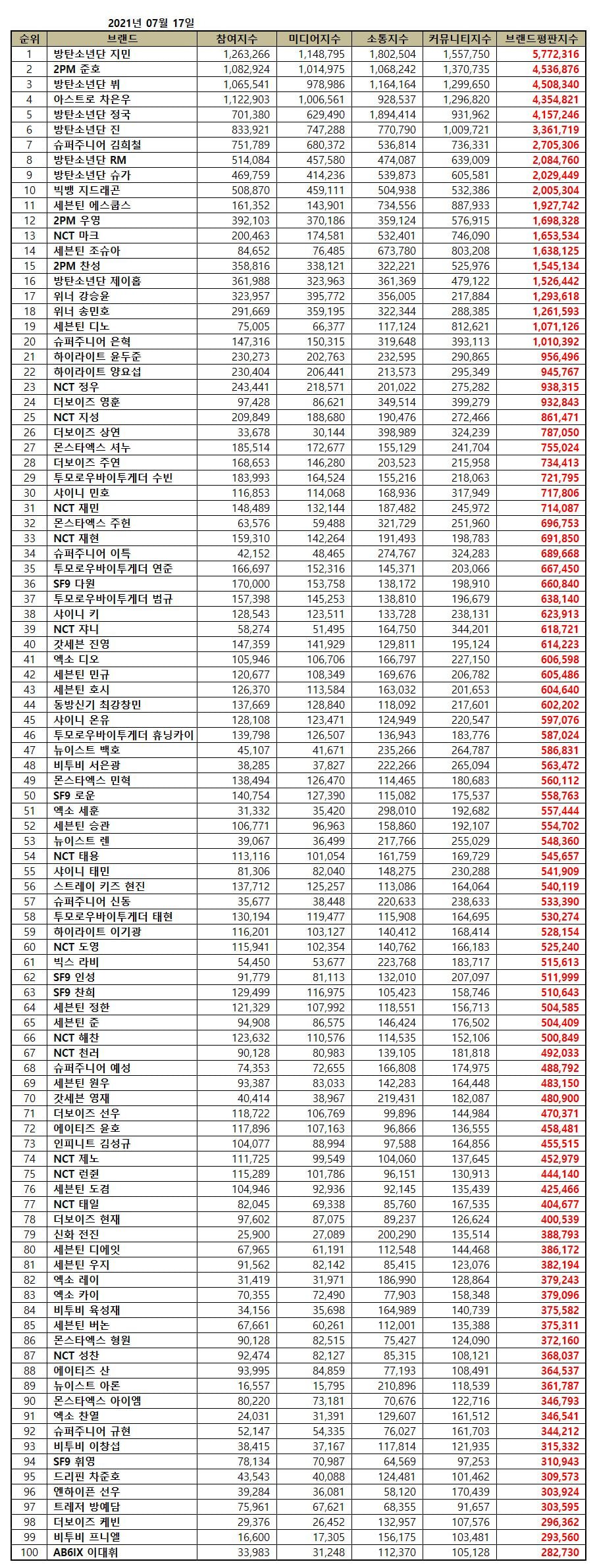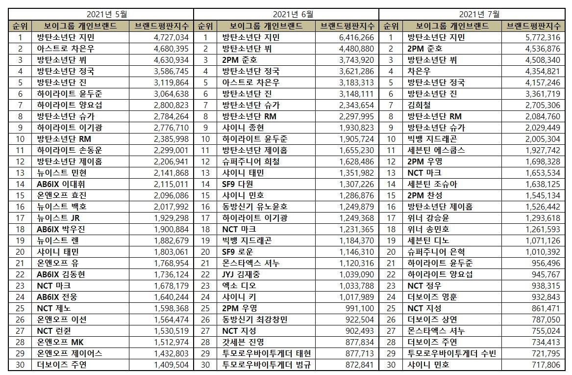 2021년 7월 보이그룹 개인 브랜드평판 30위 순위는 방탄소년단 지민, 2PM 준호, 방탄소년단 뷔, 아스트로 차은우, 방탄소년단 정국, 방탄소년단 진, 슈퍼주니어 김희철, 방탄소년단 RM, 방탄소년단 슈가, 빅뱅 지드래곤, 세븐틴 에스쿱스, 2PM 우영, NCT 마크, 세븐틴 조슈아, 2PM 찬성, 방탄소년단 제이홉, 위너 강승윤, 위너 송민호, 세븐틴 디노, 슈퍼주니어 은혁, 하이라이트 윤두준, 하이라이트 양요섭, NCT 정우, 더보이즈 영훈, NCT 지성, 더보이즈 상연, 몬스타엑스 셔누, 더보이즈 주연, 투모로우바이투게더 수빈, 샤이니 민호, NCT 재민 순으로 분석되었다.