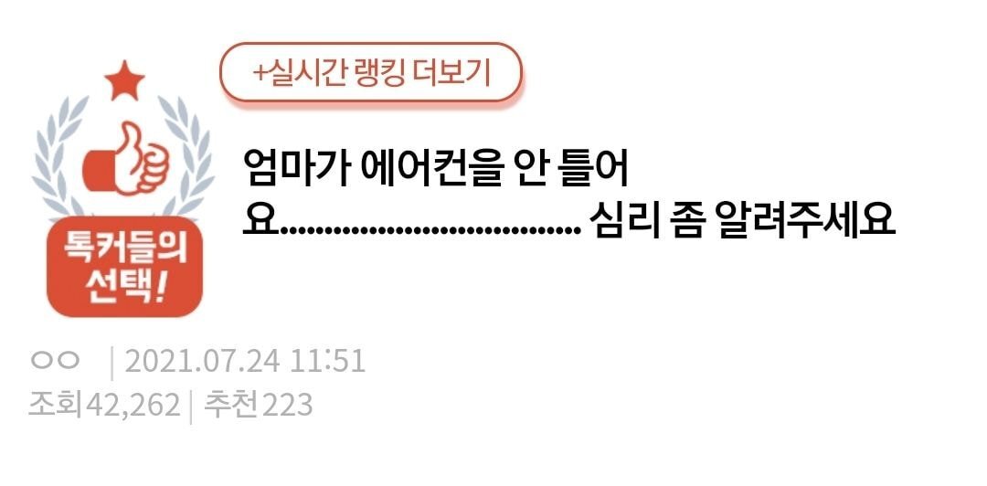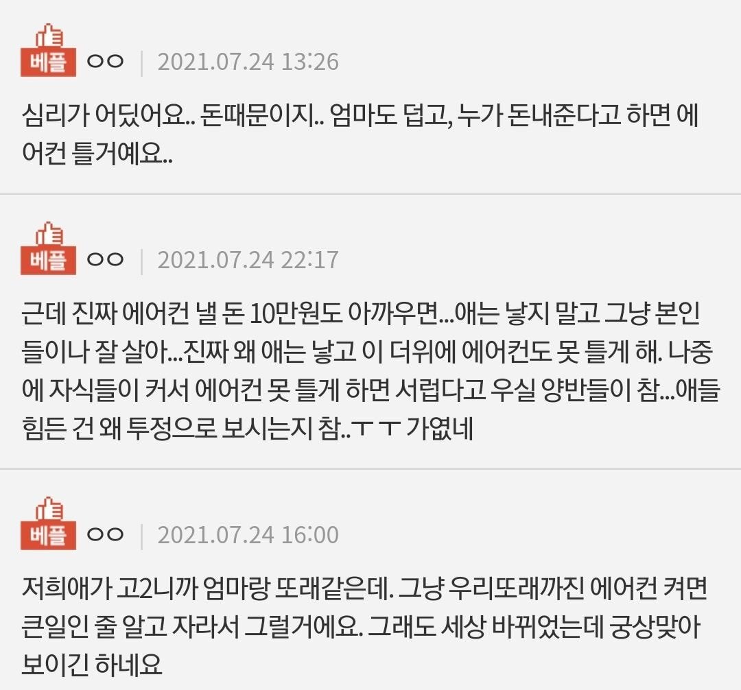 저는 거실에 딱 한 대 있는 에어컨(작동은 잘 되여)도 못 트는 현실이