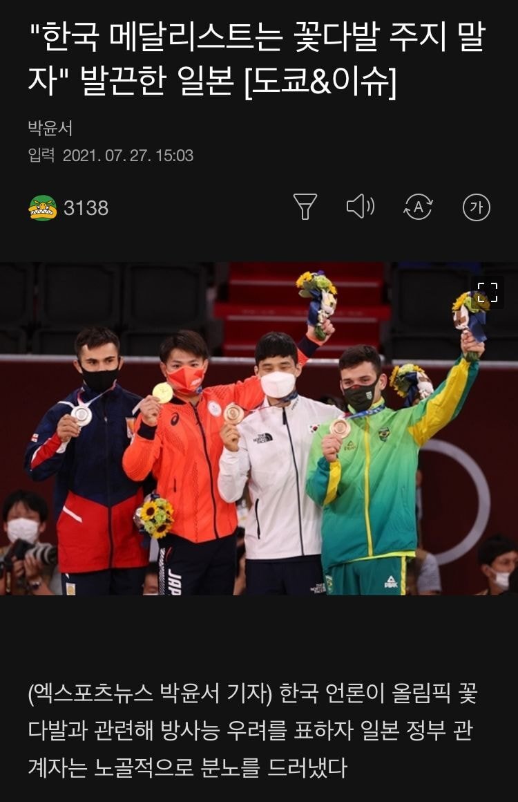 "한국 메달리스트는 꽃다발 주지 말자" 발끈한일본