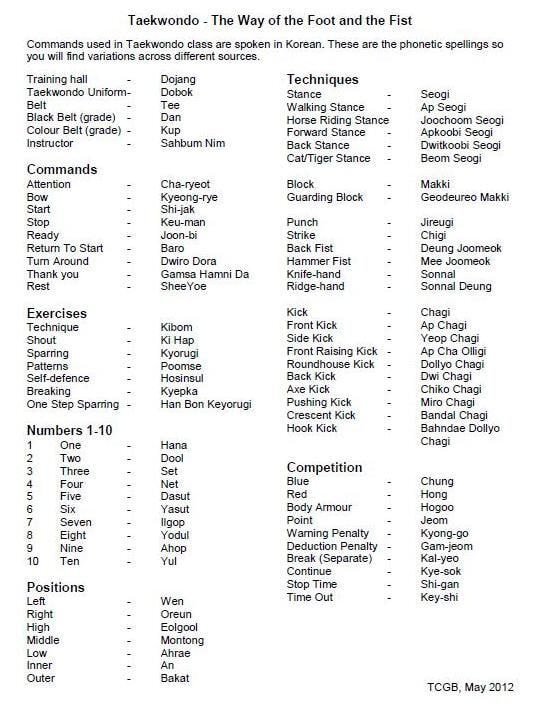 종주국이 한국이다보니 태권도 기술도 당연히 한국어.