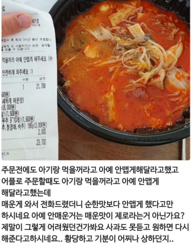 손님은 "주문 전에도 아기랑 먹을 거라고 아예 안 맵게 해달라고 했다"며 "(먹어보니) 매운 게 와서 전화드렸더니 순한 맛보다 안 맵게 했다고만 하신다"고 적었다.