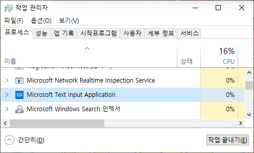 키보드에서 Ctrl+Alt+Del 누르기 → 작업 관리자 → 'Microsoft Text Input Application'를 선택 → 작업 끝내기