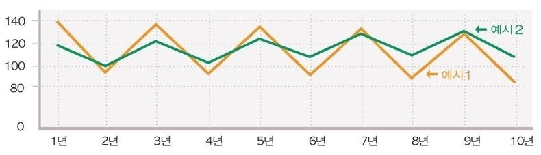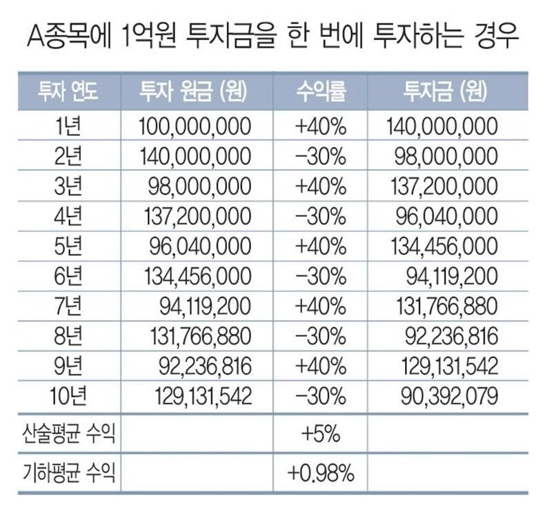 변동성이 장기투자 수익률에 미치는 영향을 알아보자. 어떤 사람이 1억원을 A종목에 10년간 투자했는데, A종목은 40%의 수익과 30%의 손실을 반복해서 기록했다고 생각해보자. 산술평균 수익률로는 매년 5%의 이익을 거둘 거 같지만 실제 결과는 다음과 같다.