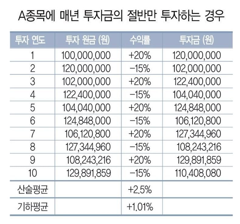 투자하는 이유는 종자돈을 불리고 화폐가치 하락에 대응하기 위해서다. 단일 매매로 높은 수익률을 거둔 적이 있다는 경험을 해보기 위해서가 아니다. 장기간 투자로 성공하기 위해서는 꼭 포트폴리오의 기하평균 수익률을 높이기 위한 의사결정과 행동을 취해야 한다.