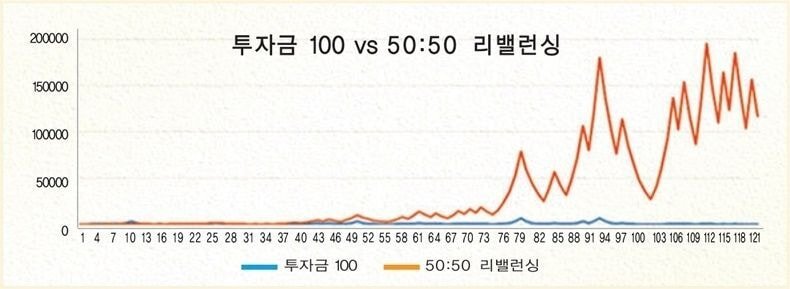 만약 100원의 투자금을 걸고 게임을 시작한다면 운이 좋아 돈이 불어날 때도 있지만 반대로 돈을 계속 잃기도 한다. 이 게임의 변동성은 크지만, 장기수익률은 0에 가깝다(기하평균 기댓값이 0이기 때문). 섀넌은 이 게임을 진행할 때 자신이 가지고 있는 투자금의 절반만 투자해서 게임을 한다면 단기적으로는 결과를 예측할 수 없지만, 장기적으로는 엄청난 수익을 달성할 수 있다고 했다. 매번 주사위를 던질 때마다 자신의 전체 자산의 50%만 이 게임에 투자하며, 나머지 절반은 현금으로 보유한다. 이러한 50:50 리밸런싱 전략을 사용해서 같은 결과에 대입시켜봤더니 아래와 같이 투자금이 우상향하는 것을 볼 수 있다.