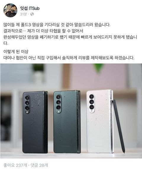 잇섭이 삼성에게 협찬 받고 영상 찍었는데 리뷰 내용이 삼성과 타협이 안됐는지 결국 영상 폐기하고 협찬 안받고 내돈내산으로 다시 영상 찍겠다는 잇섭