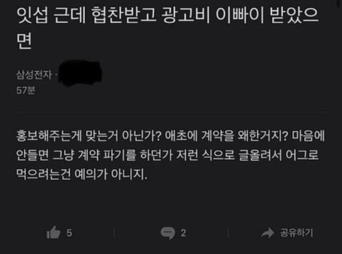 어그로로 조횟수 올리려는 느낌도 들고. 광고한다는 계약하고 제품 공식적으로 풀리기전에 미리 받아서 실컷 써보고 테스트 해본것도 혜택인건데 이제와서 계약파기하고 반대로 이미지 타격주면 내가 삼전 직원이라도 빡칠듯. 유투버 갑질 같기도함