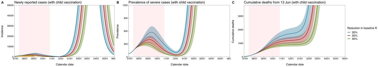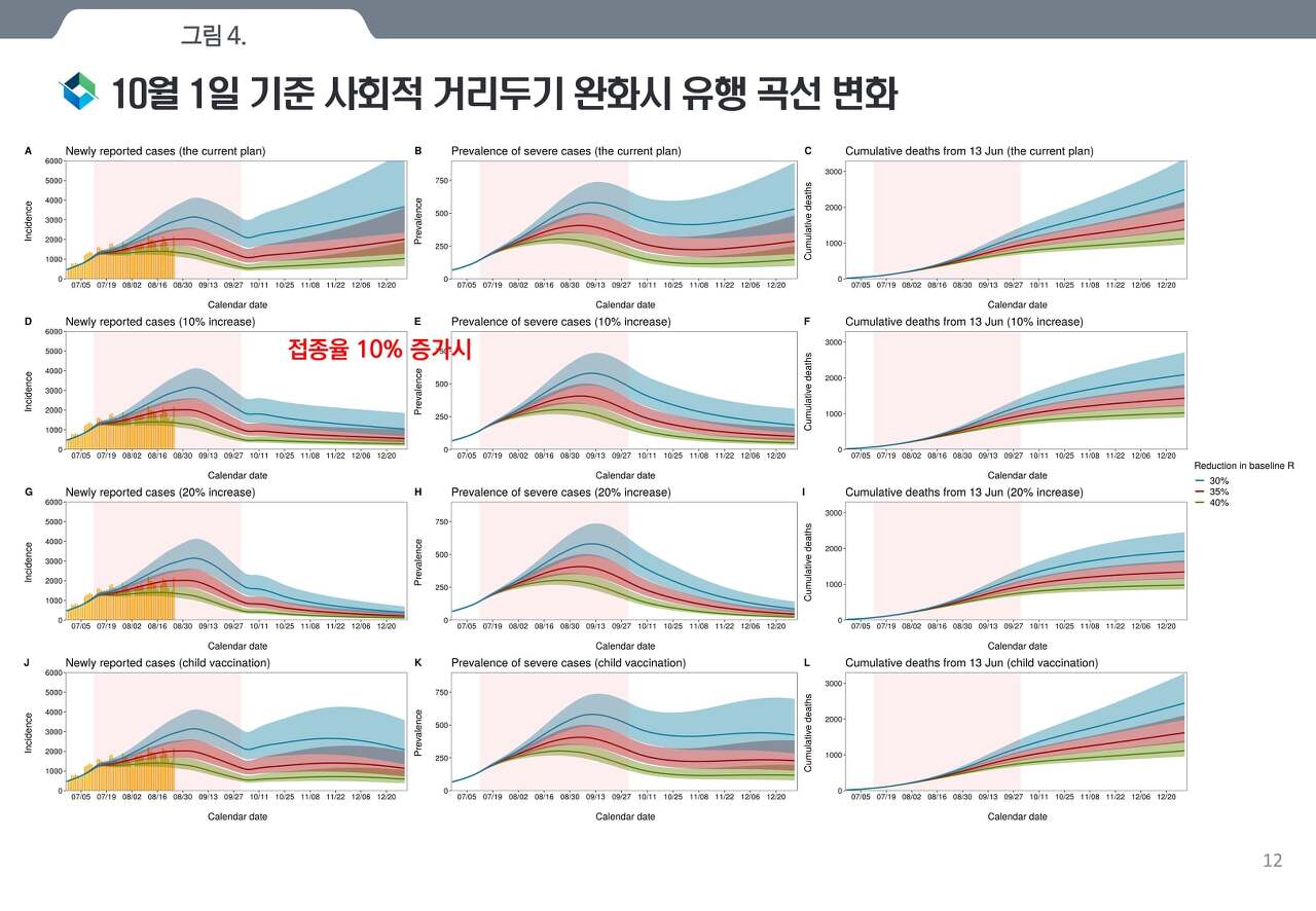 - 그러나 접종율은 높으면 높을수록 좋습니다. 그림 4는 저와 교토대 정성목 선생님이 연구 중인 시뮬레이션 결과입니다. 우리나라의 현재 50대 미만 접종 예약율이 현재 보다 10%만 높아지더라도 방역 완화 시 유행 곡선의 방향 자체가 변화합니다.(그림 4) 높은 접종율은 더 빨리, 더 강하게 방역완화로 나아갈 기반이 되며, 백신 접종율과 방역완화는 비례관계를 가집니다.