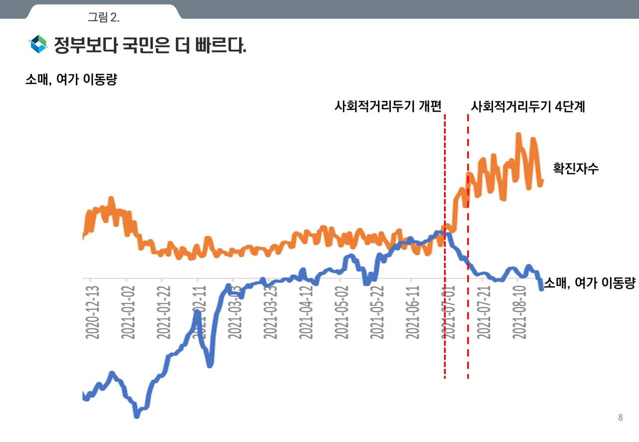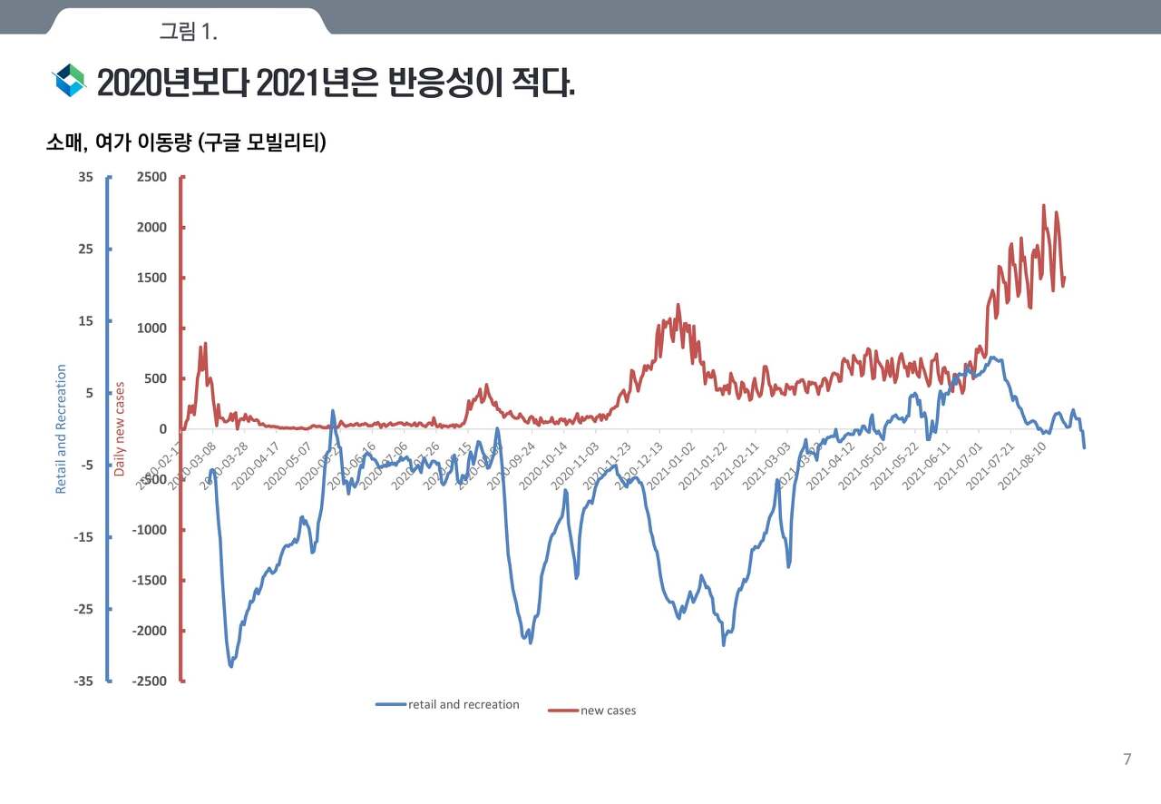 - 저는 몇 가지 가설을 제시해드립니다. 첫번째는 우리 국민의 뛰어난 반응성입니다. 사회적 거리두기의 간접적 지표로 활용되는 구글 이동량 분석 결과를 보면 흥미로운 사실이 확인되는데, 먼저 국내 소매와 여가활동 이동량 감소가 2020년에는 단계 상향과 유행에 따라 큰 폭으로 변화하지만 2021년에는 그 정도의 반응성은 보이지 않습니다. 즉 사회적 거리두기에 대한 피로감이 심해지고 있다고 해석할 수 있거나, 우리 사회가 사회적 거리두기에 맞는 생활상에 적응하고 있다고 볼 수 있습니다. (그림 1)