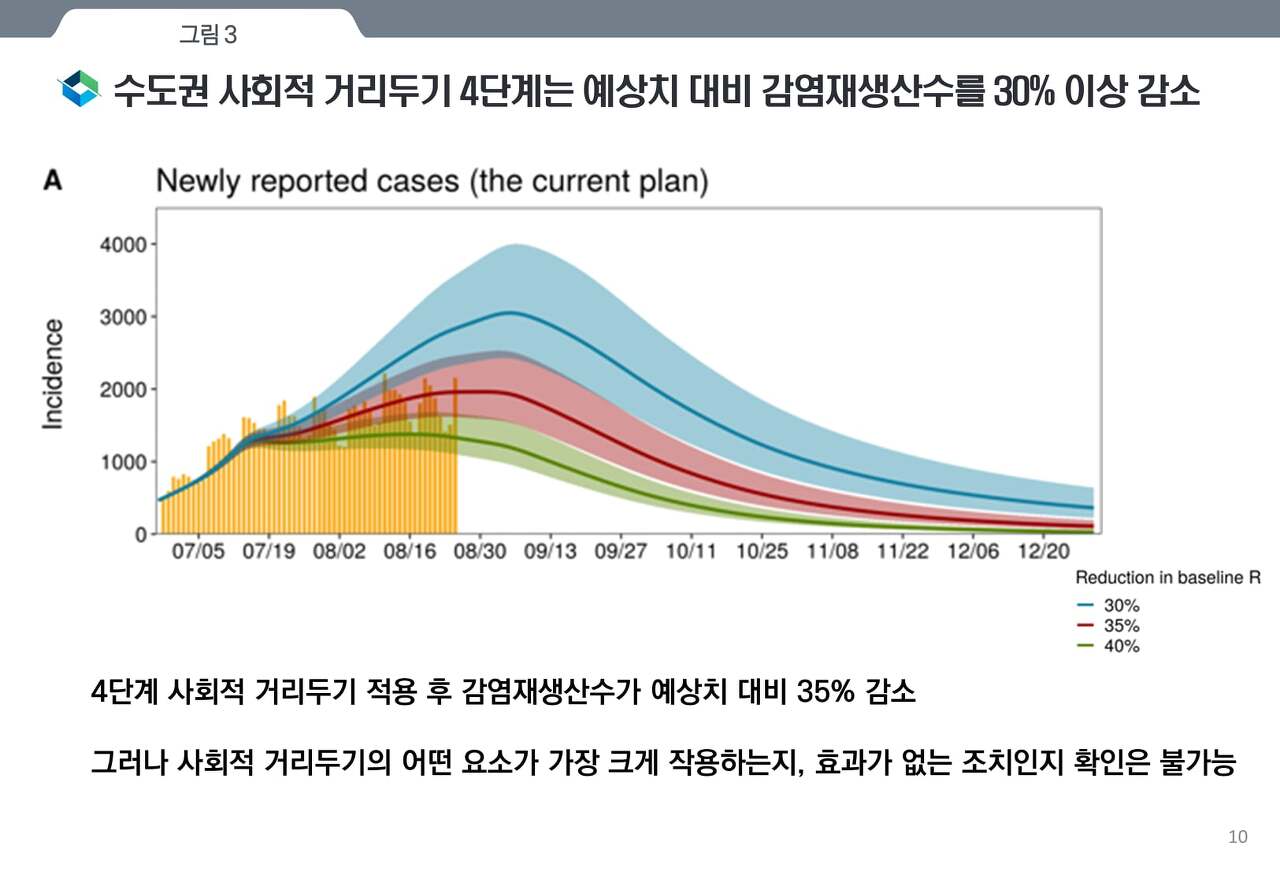 - 이는 몇 가지 이유가 있습니다. 먼저 사회적 거리두기 정책은 한번에 한가지만 시행되지 않습니다. 수도권의 사회적 거리두기 4단계만 해도 1) 사적모임 제한, 2) 다중 이용시설 집합 금지, 3) 영업시간 제한, 4) 행사 집회 차단, 4) 스포츠 관람 제한, 5) 종교활동 제한 등이 동시에 이루어집니다. 과연 이 조치 중 실질적인 효과가 있는 정책과 아닌 것을 분리하여 분석하기는 불가능합니다. 우리나라의 4차 대유행에서도 예측치와 4단계 사회적 거리두기 후의 유행곡선을 분리해보면 사회적 거리두기 단계 상향은 유행 규모 감소와 분명히 관련이 있습니다. 그러나 사회적 거리두기의 어떤 요소가 방역에 도움이 되는지 확인은 어렵습니다.