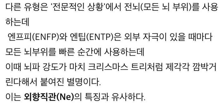 유형별로 주로 사용하는 뇌기능과 아닌 기능이 나뉘는데 ENFP, ENTP 두 유형은 외부 자극 강도에 따라 뇌의 모든 기능을 동시다발적으로 사용한다. 외향직관의 특징과 유사하며 뇌파가 마구잡이로 빤짝이는 모습 때문에 '크리스마스 트리'라는 별명이 있다.