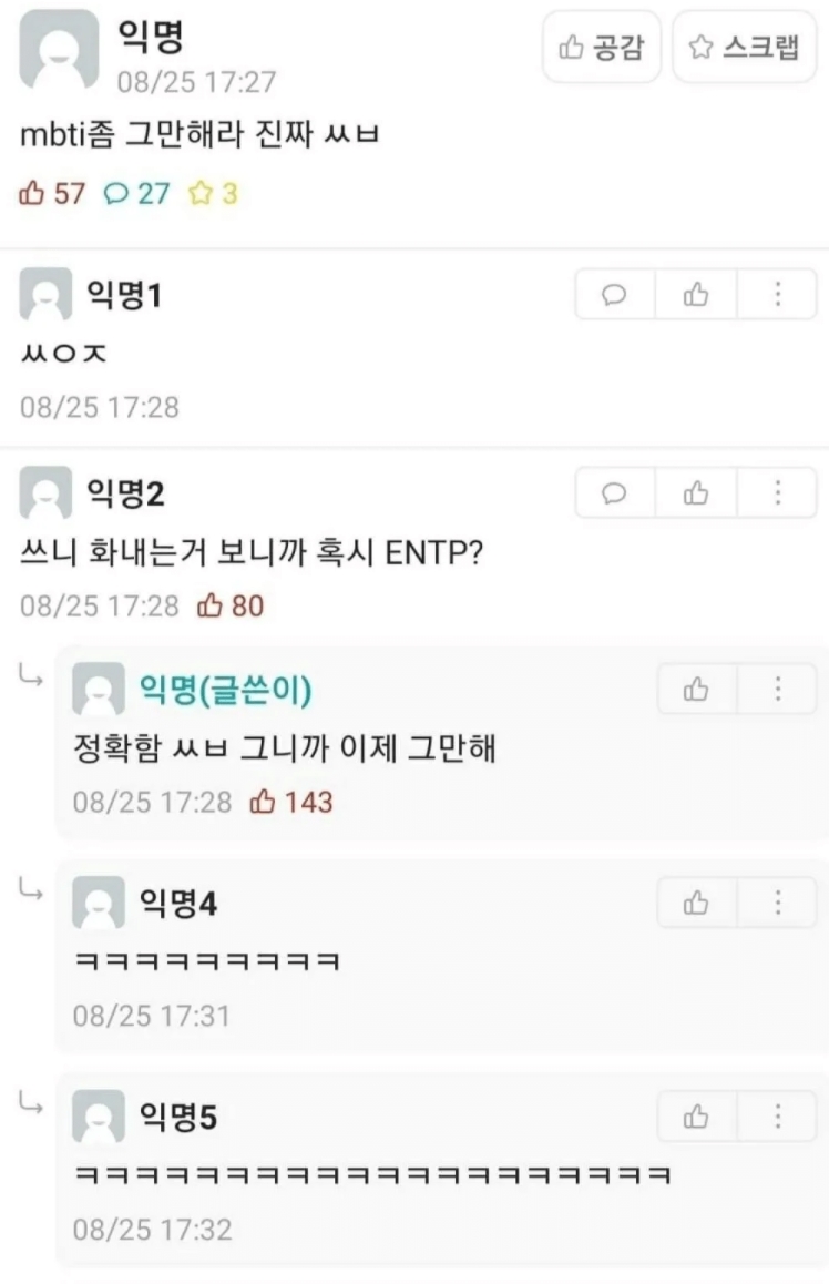 | MBTI 유형별 내가 한심한 순간은 (0) | 2020.10.04 |