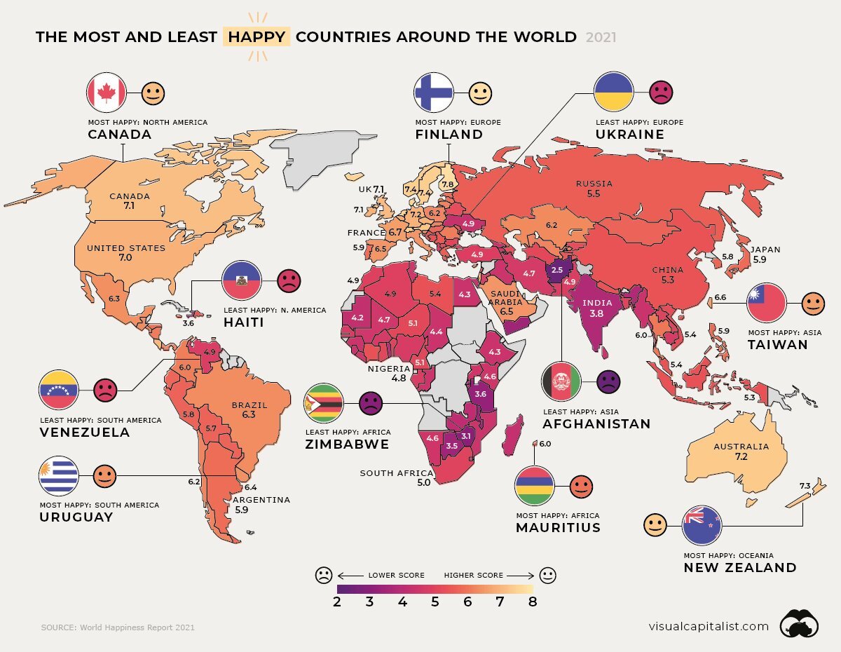 유럽 최고 행복 : 핀란드 7.8 / 최저 행복 : 우크라이나 4.9