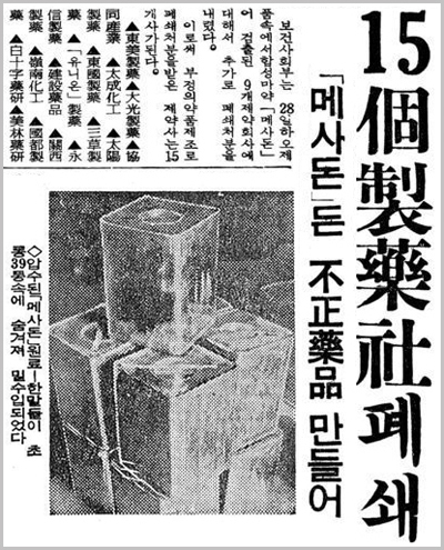 1965년 대한민국을 뒤집은 '메사돈 파동'은 제약회사들이 합성마약 메사돈을 넣은 의약품을 팔아 평범한 사람들을 마약중독자로 만들었던 사건이다. 기업윤리는 개나줘버린 제약회사와, 부패한 공무원과, 뒤를 봐주던 정치인의 3박자가 잘 맞은 희대의 좆같은 사건이다.