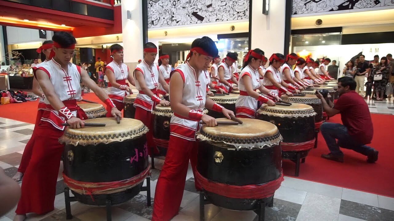 한복입고 '삼고무북' 치기. 한국은 세로로 북을 매달아치는 '무북'을 침.