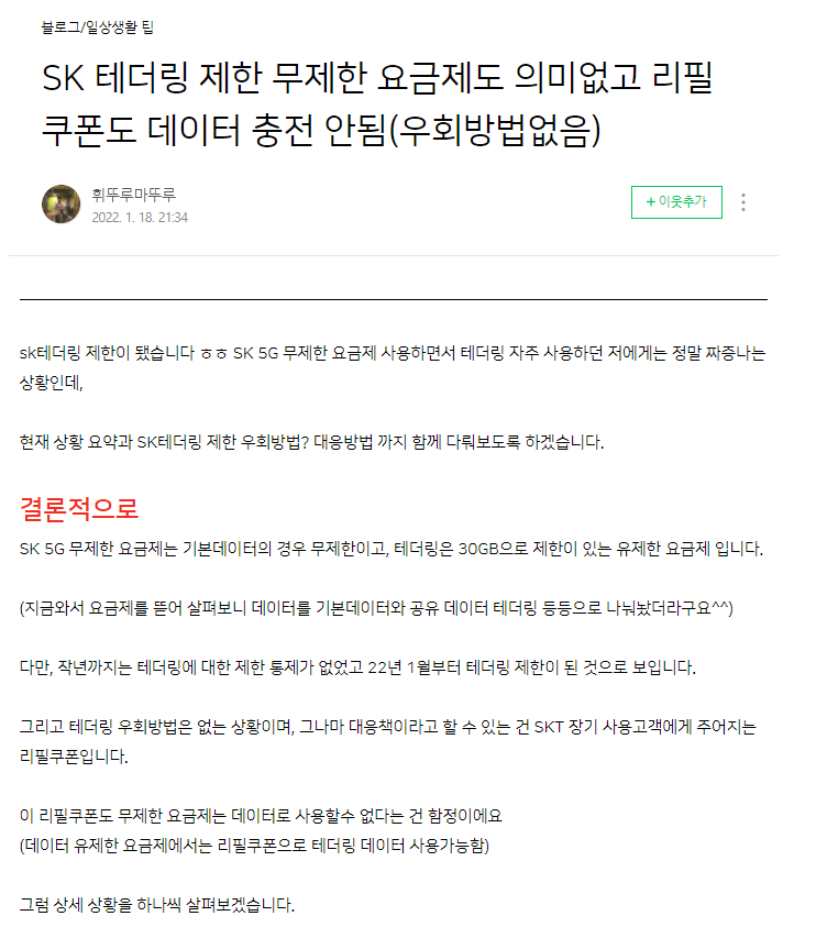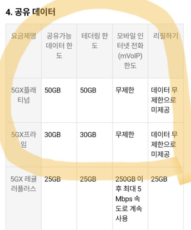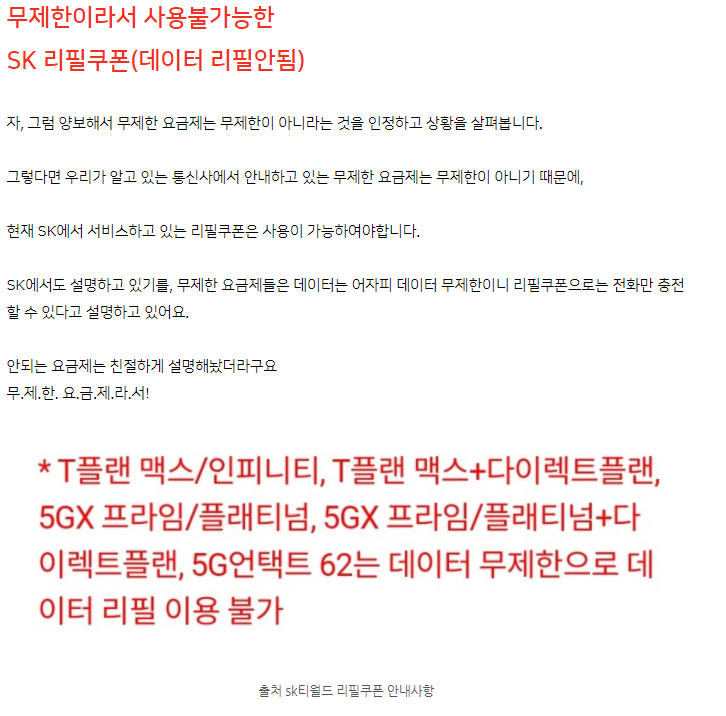 2. sk 같은 경우에는 무제한 요금제 쓰면 데이터 리필도 불가능함