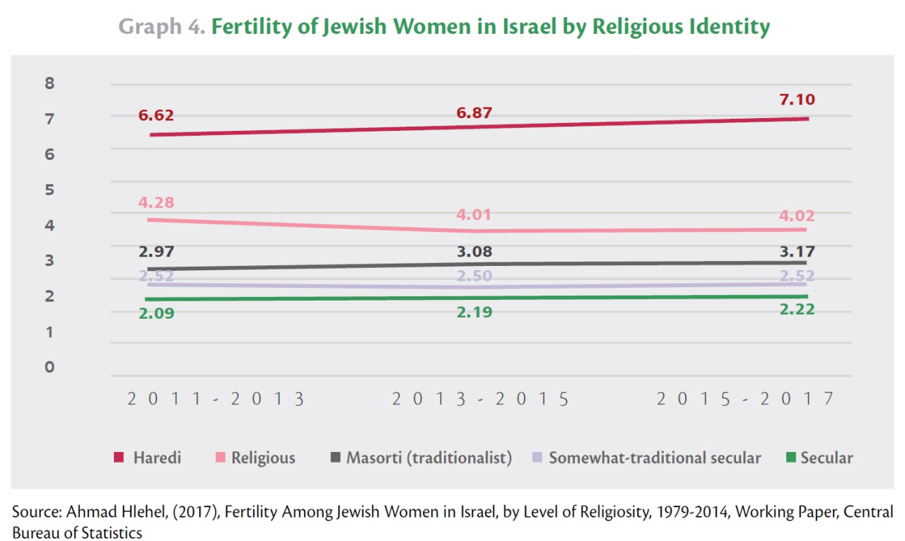 그런데 가장 낮은 세속적인 이스라엘 사람들도 인구 유지에 필요한 2.2 이상의 출산율을 보이고 있음