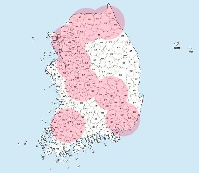 서울(수도), 인천, 평택(미군 기지), 강원도(군사 밀집) 및 대전, 대구, 울산, 광주, 목포 같은 대 도시들.