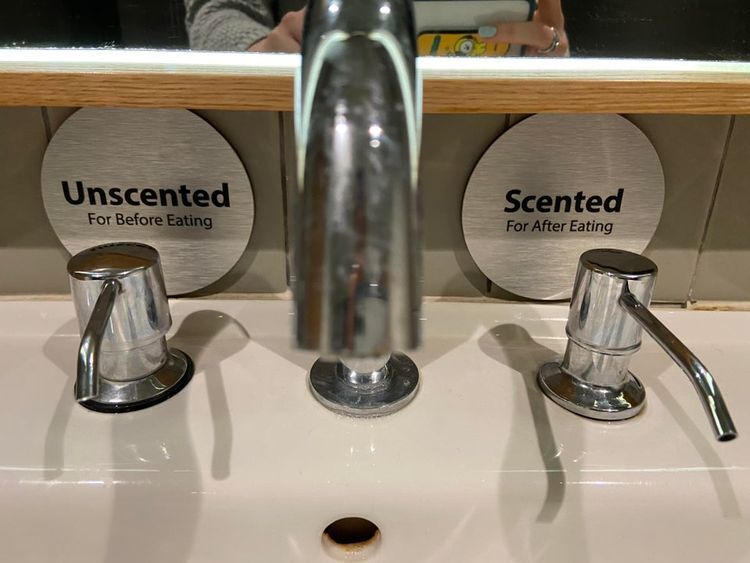 밥 먹기 전에는 무향, 밥 먹고 난 다음에는 향 있는 비누가 나오는 레스토랑 세면대