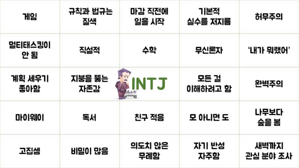 오늘은 MBTI 성격유형인 INTJ 특징에 대해 알아봤는데요. INTJ 특징은 약간 특이하죠? 재미있게 읽으셨다면 공감과 댓글 부탁드립니다! MBTI 글은 재미로 읽어두시는 편이 제일 좋습니다. INTJ 특징말고 다른 친구들의 특징들도 한번 알아보시길 발바니다!