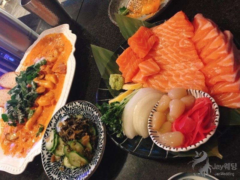 어쨌든 육회, 연어, 칠리치즈프라이, 로제떡볶이 등이 맛있당. 밑반찬으로 나오는 미역줄기도 굿.
