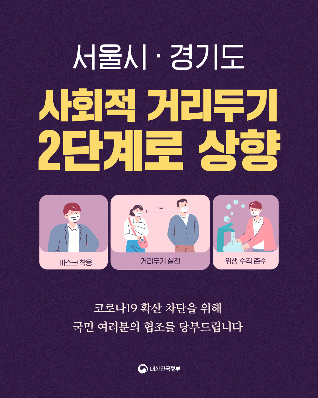 현재 상황은 사회적 거리두기가 1단계에서 ~ 2단계로 격상되었다.